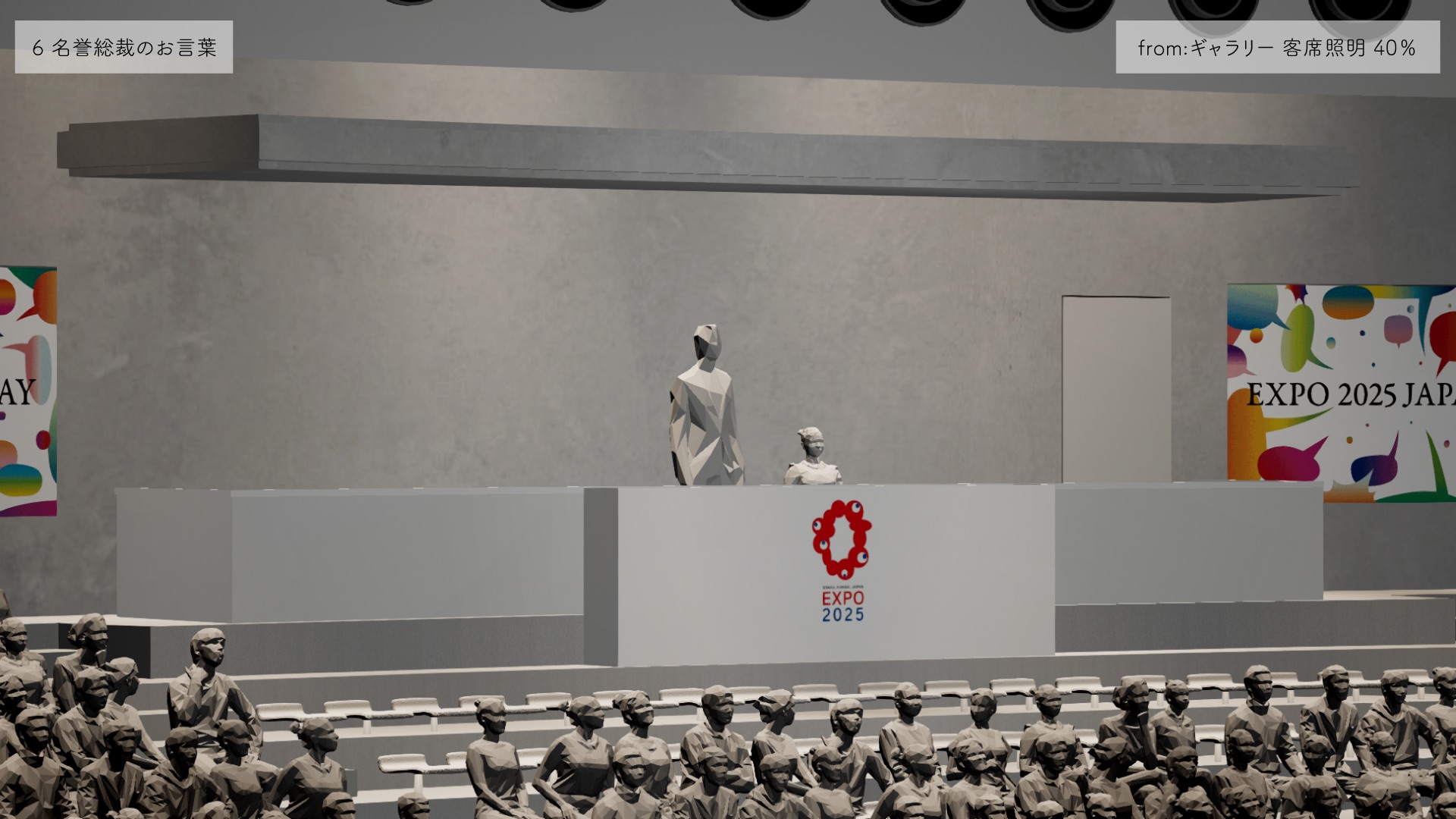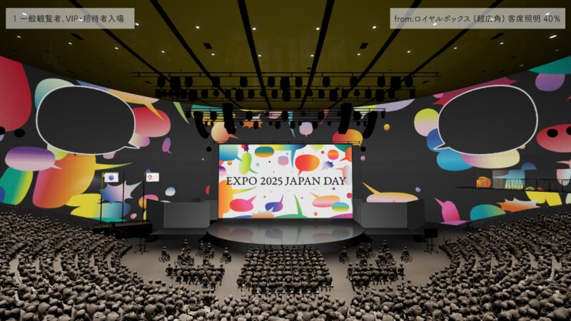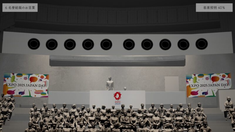 大阪・関西万博の開催国である日本のナショナルデー「ジャパンデー」の演出シミュレーションを、Unreal Engineを用いて開発した。当イベントはスケジュールの都合上、リハーサルの時間が確保できなかったため、事前にすべての演出をシミュレーションする必要があった。