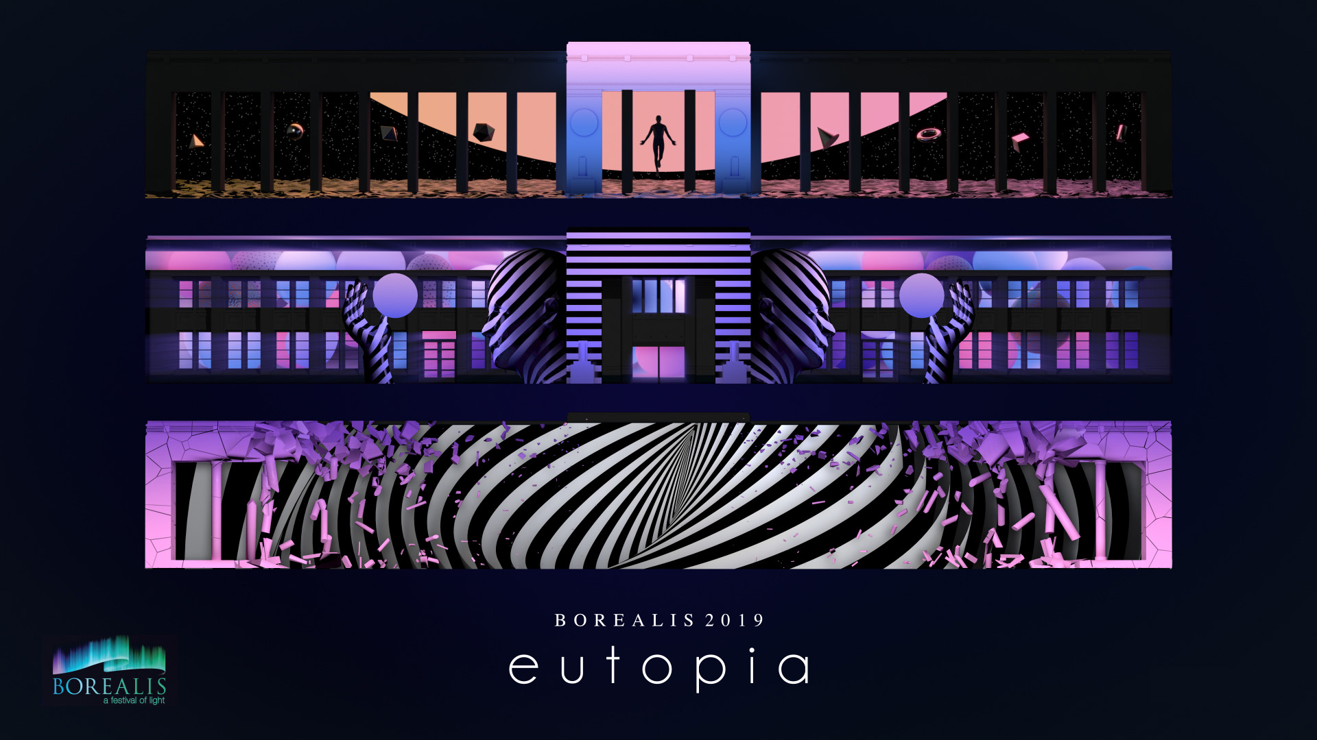 Borealis is the largest lighting festival in North America. Projection mapping works by several teams selected from around the world are shown on the screen at the Museum of Industrial History (MOHAI) in Seattle. Our team submitted an artwork based on the concept of utopia and was selected as a finalist.
