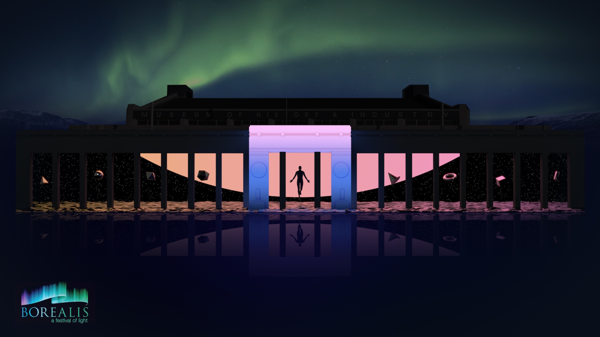 北米最大のライティングフェス、ボレアリス。シアトルの産業歴史博物館 (MOHAI) をスクリーンに、世界中から選ばれた数チームのプロジェクションマッピングの作品が上映される。当チームはユートピアをコンセプトにアートワークを提出し、ファイナリストに選出された。