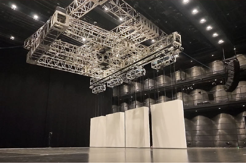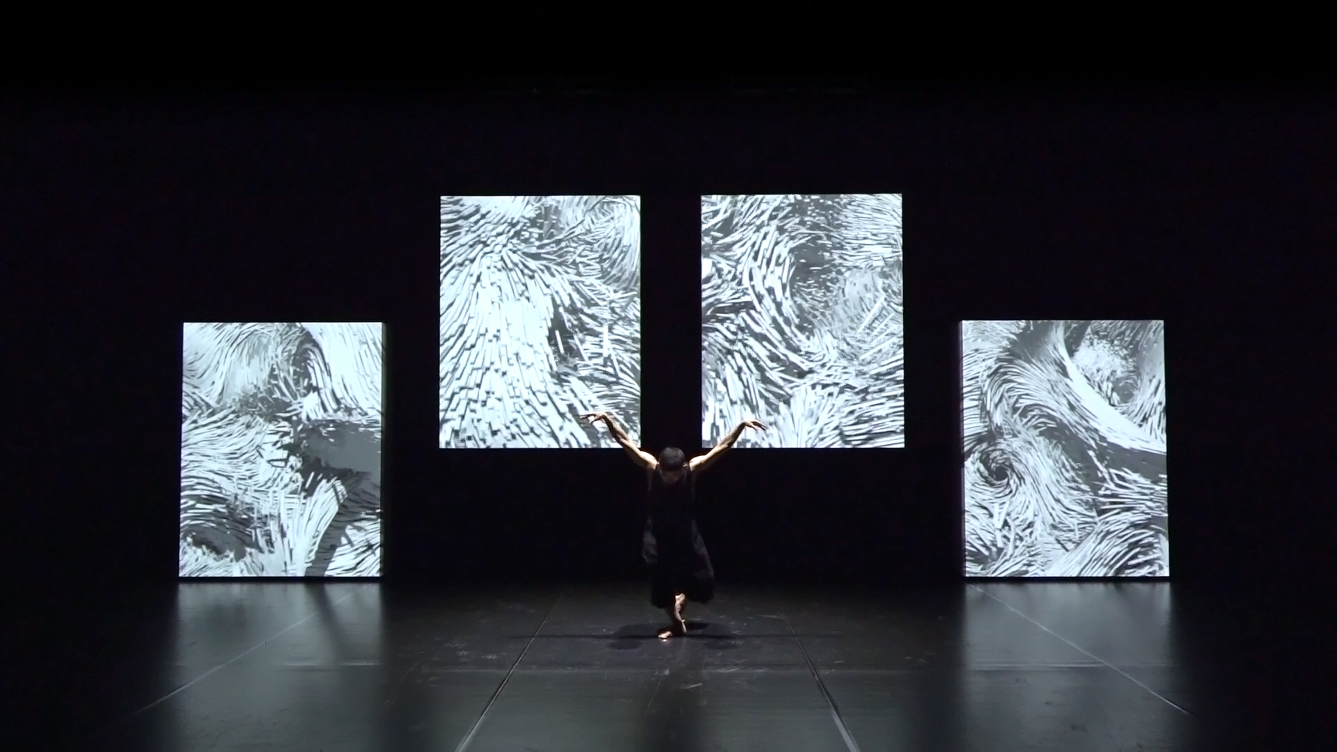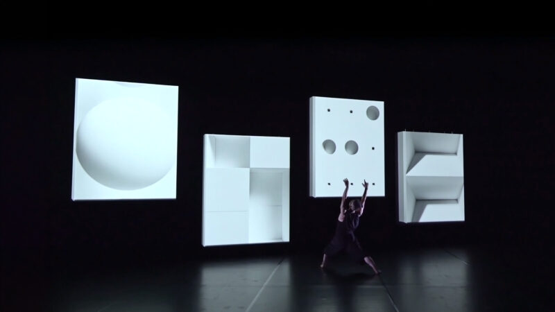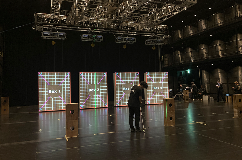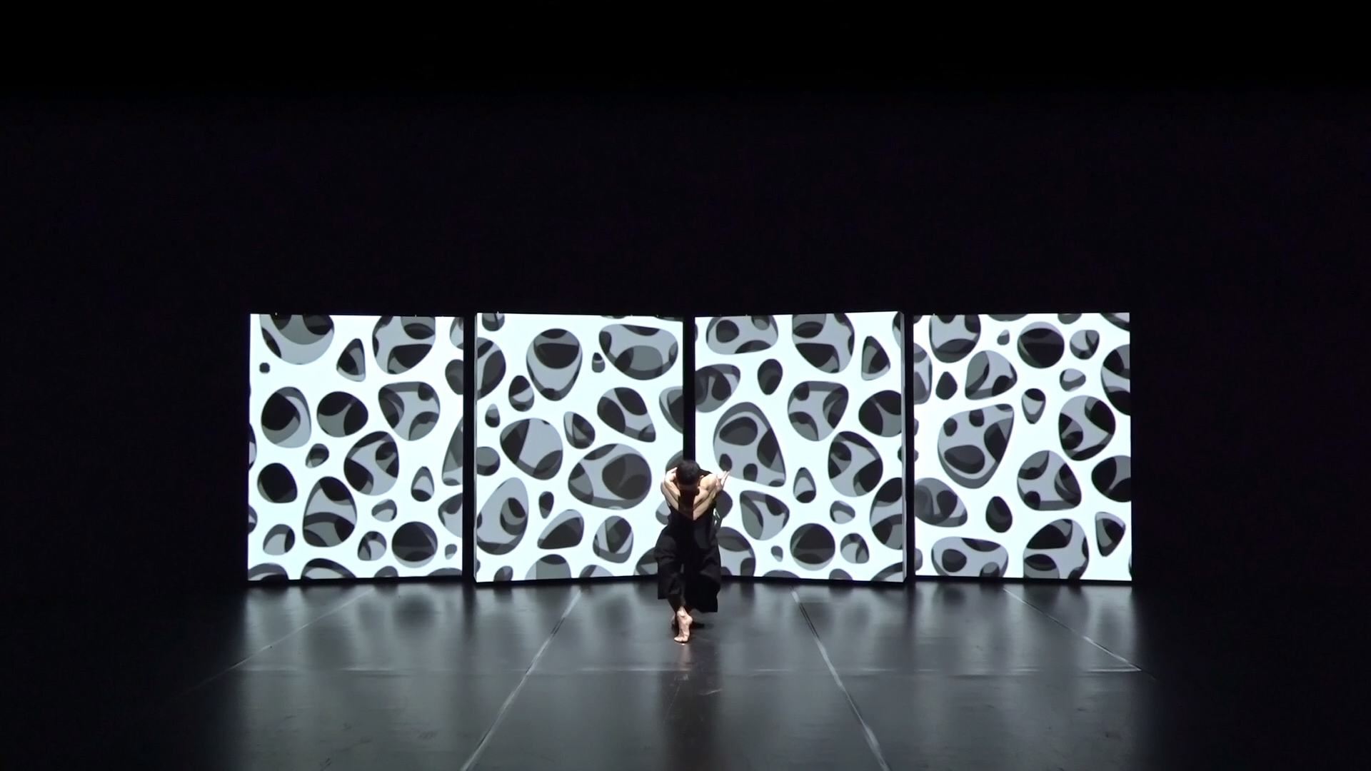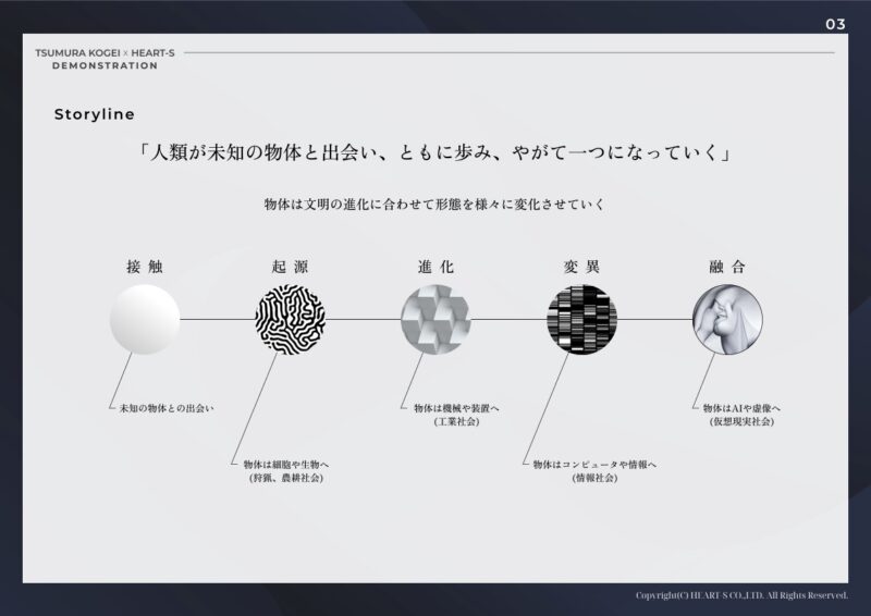 Tsumura Kogei Co., Ltd.’s “Tsumura Module System” (control of stage mechanisms such as motors and wires) and Heart’s Co., Ltd. (control of production equipment such as lighting and video) have jointly developed an automation system for stage progress. This work is a promotional video for the system, and is composed of four cubes that move freely through space, linked with projection mapping that follows them. The work depicts humanity encountering an unknown intelligent object and evolving together, while promoting the technological features of both companies.