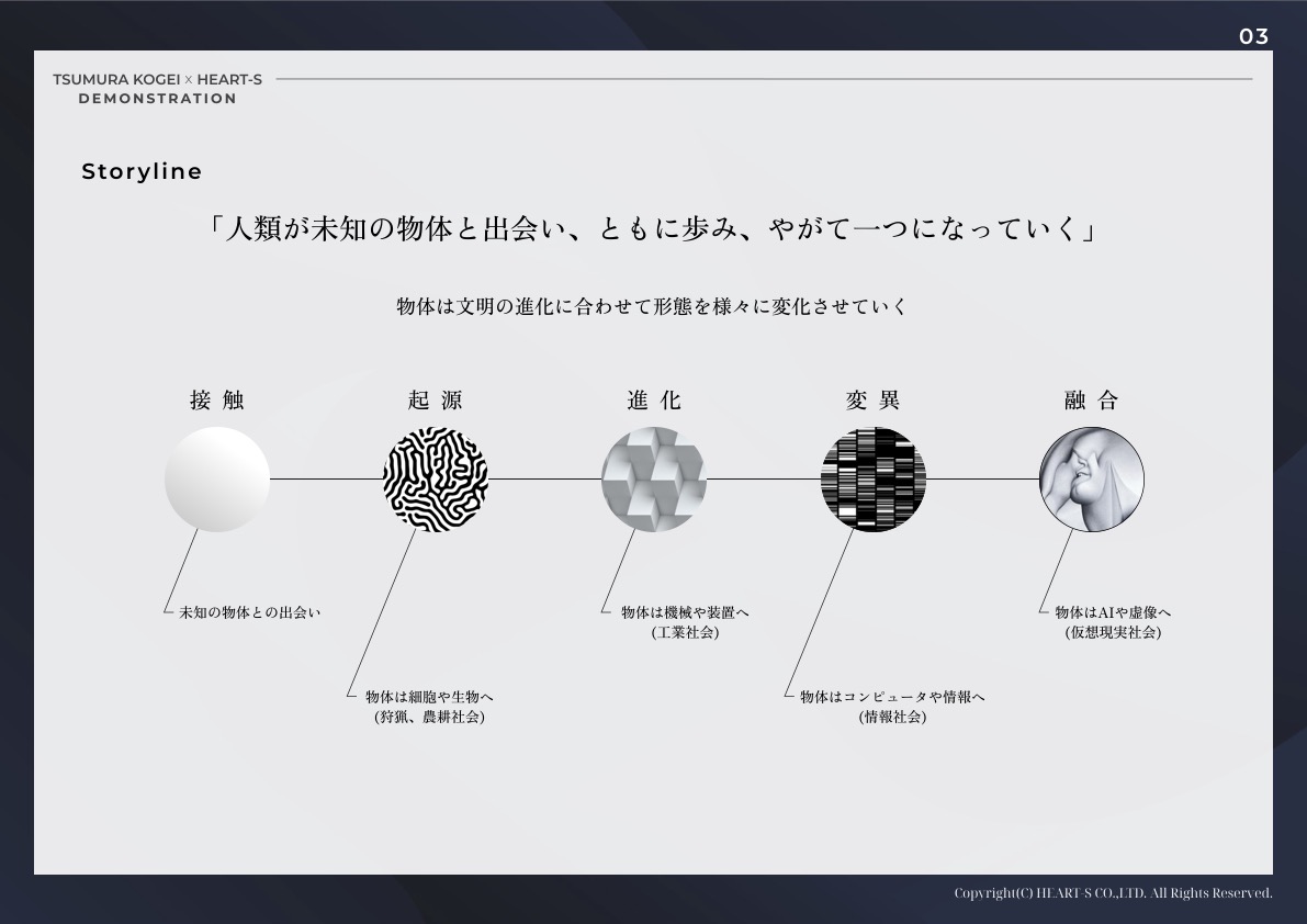 株式会社つむら工芸の「ツムラモジュールシステム」(モーター・ワイヤー等の舞台機構制御)と、株式会社ハートス(照明・映像等の演出機器制御)と共同で、舞台進行のオートメーションシステムを開発した。本作はそのプロモーション映像であり、空間を自在に動く4つの立方体と、それに追従するプロジェクションマッピングを連動させた構成となっている。作品は人類が未知の知的物体と遭遇し、共に進化していく様を表現しながら、両社の技術的特徴を訴求している。