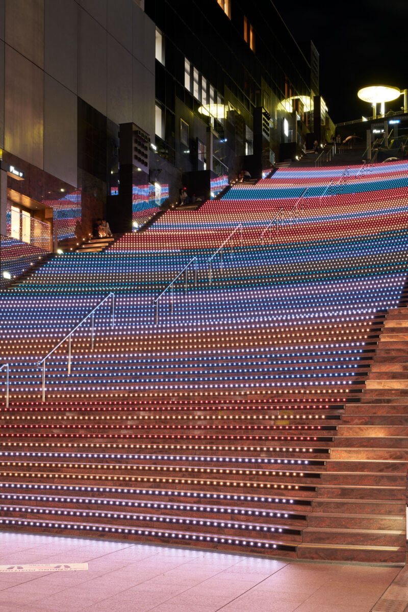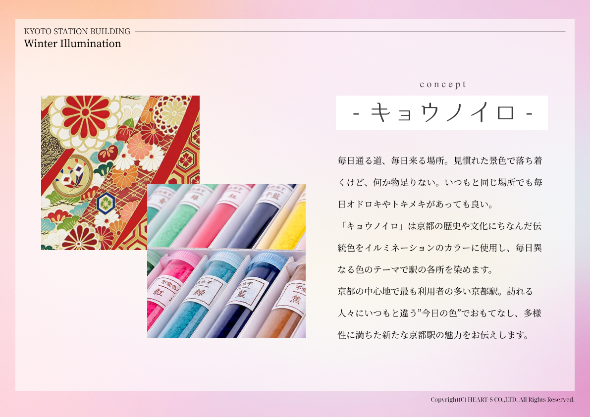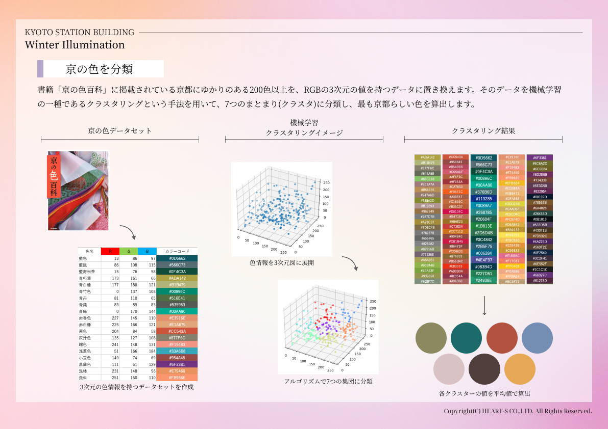 “KYOTO COLORS” is a production that expresses the essence of Kyoto using over 200 colors associated with Kyoto. Set at Kyoto Station, which is a popular tourist destination, machine learning was used to extract and utilize the color that best represents Kyoto from the 200 colors, conveying the charm of Kyoto to visitors.