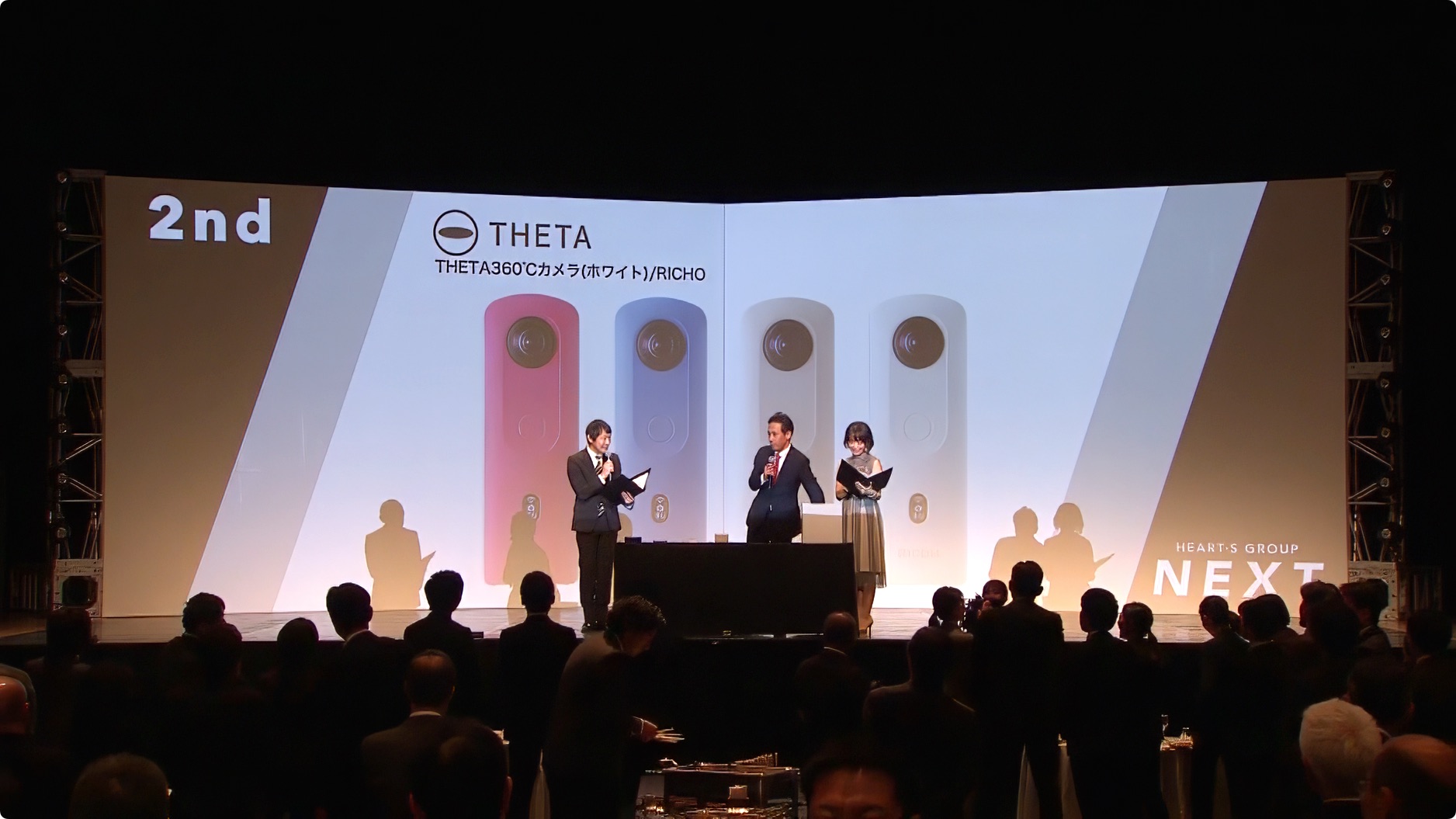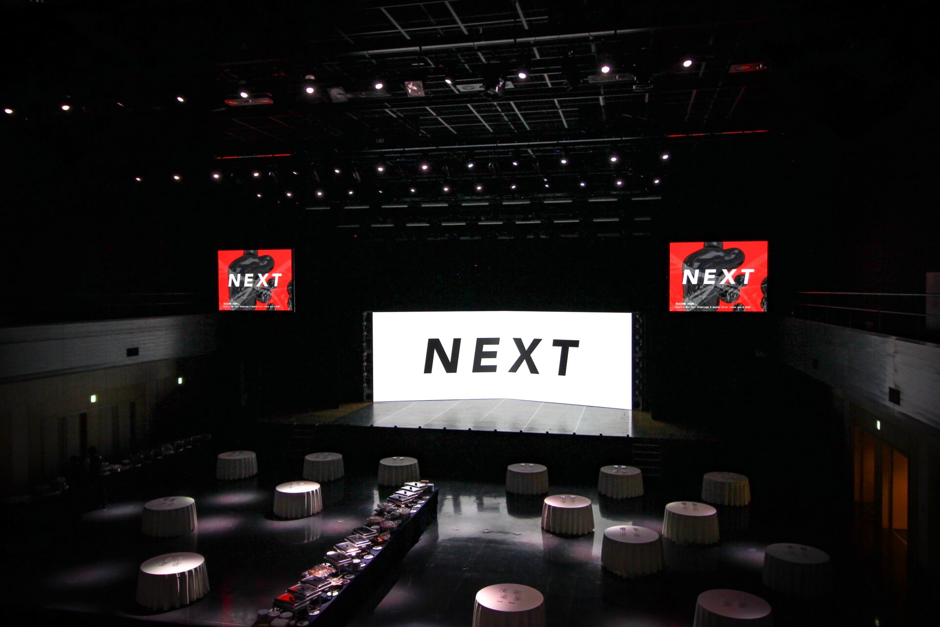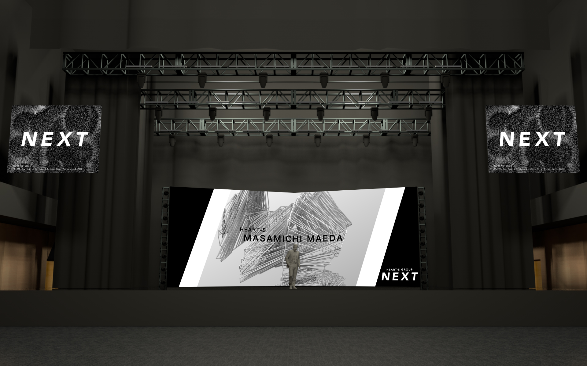 ハートスグループの新年イベントが新たに「NEXT」としてリニューアル。そのコンセプト立案から企画、ステージデザイン、演出、映像にいたるクリエイティブ面のすべてをディレクションした。堂島リバーフォーラムのステージにはシンボリックなプロジェクションマッピング映像を設け、プログラムにはグループ代表によるプレゼンテーション、ダンサーによるアトラクション、e-sportsのゲーミング企画などを盛り込んだ。「モダン」をテーマに、映像はプログラミングによる近代的でジェネラティブなアートワークで構成した。