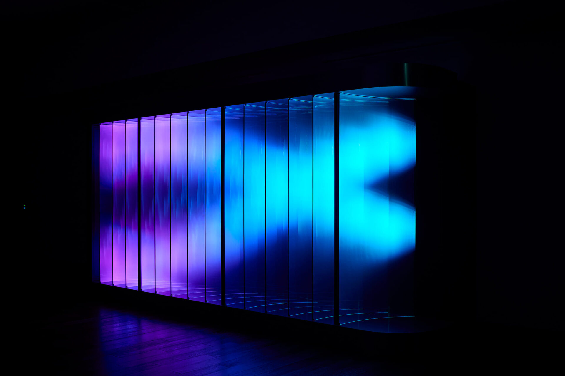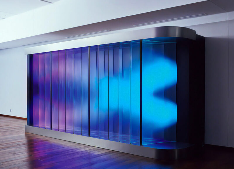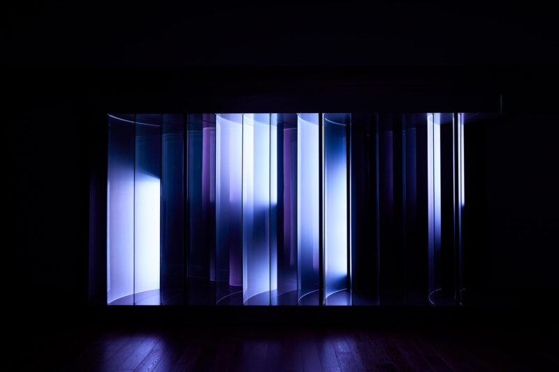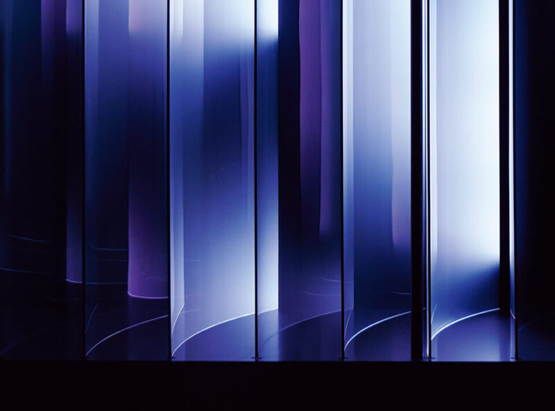 This is a light installation in which RAYCREA™, a film with special optical properties developed by Nitto Denko, is attached to an acrylic plate. RAYCREA™ is normally a colorless and transparent film, but when light is inserted into it, it emits light like a light guide. By taking advantage of this property, LED point light sources can be made to appear as surface light, expressing the diffusion and depth of light, providing viewers with a new light experience.