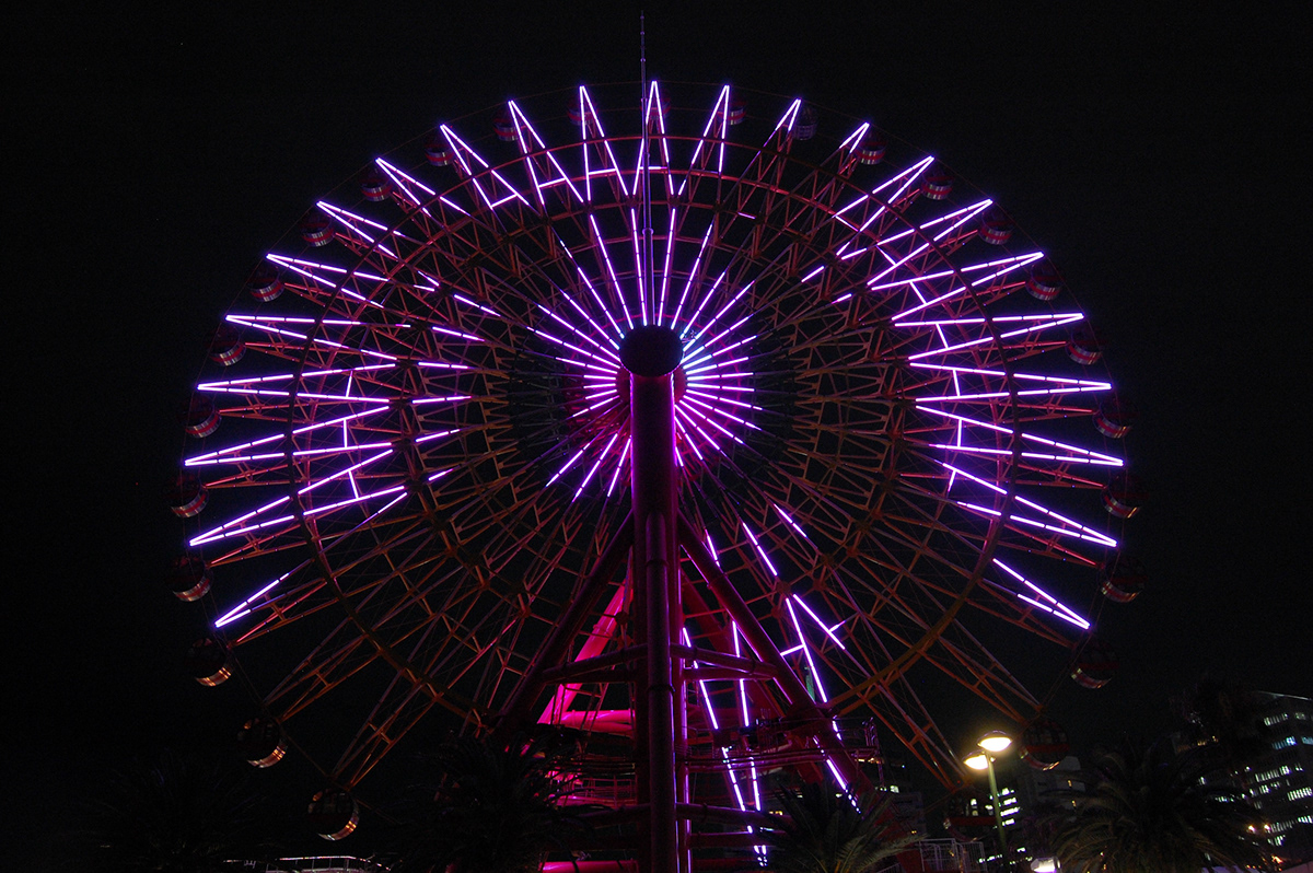 This work is ferris wheel illumination that incorporating “Silhouette Animation” which stand out the outline. Renewed from the traditional neon tubes to LED lighting, for the first time in Japan, We tried lighting direction by animation in Ferris wheel’s very limited depiction area. The concept is “Kobe-ness” , and consists of three themes of Time, People, Town. We directed it by video contents, not traditional mechanical lighting direction to cause to feel people nostalgic atmosphere and time of eternity.